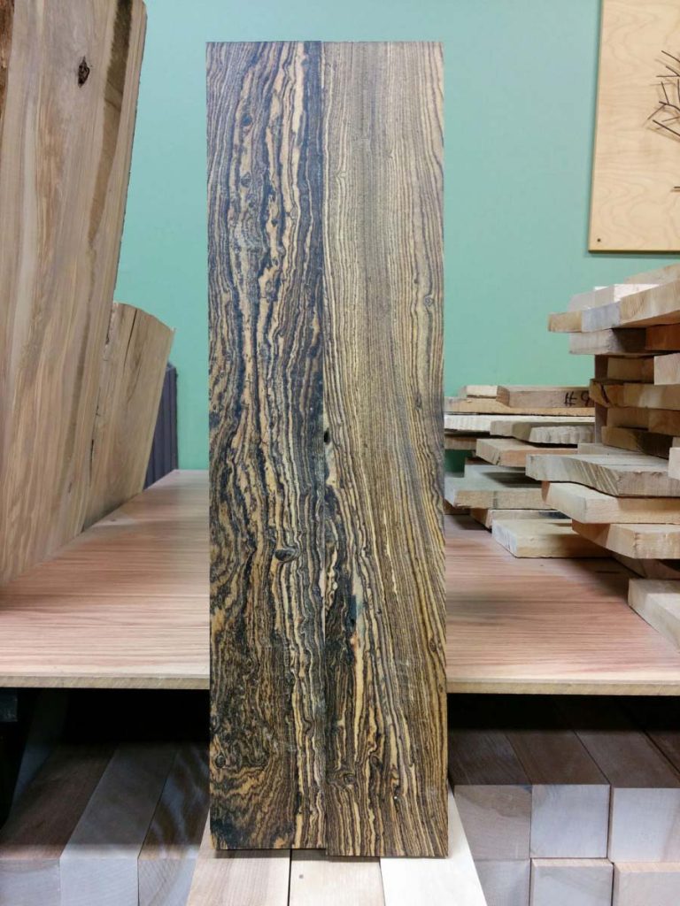 Description : Brun jaunâtre à brun doré, veines noires marquées. Essence décorative, dure et durable, idéale pour marqueterie, placage, meubles, poignées et lutherie.