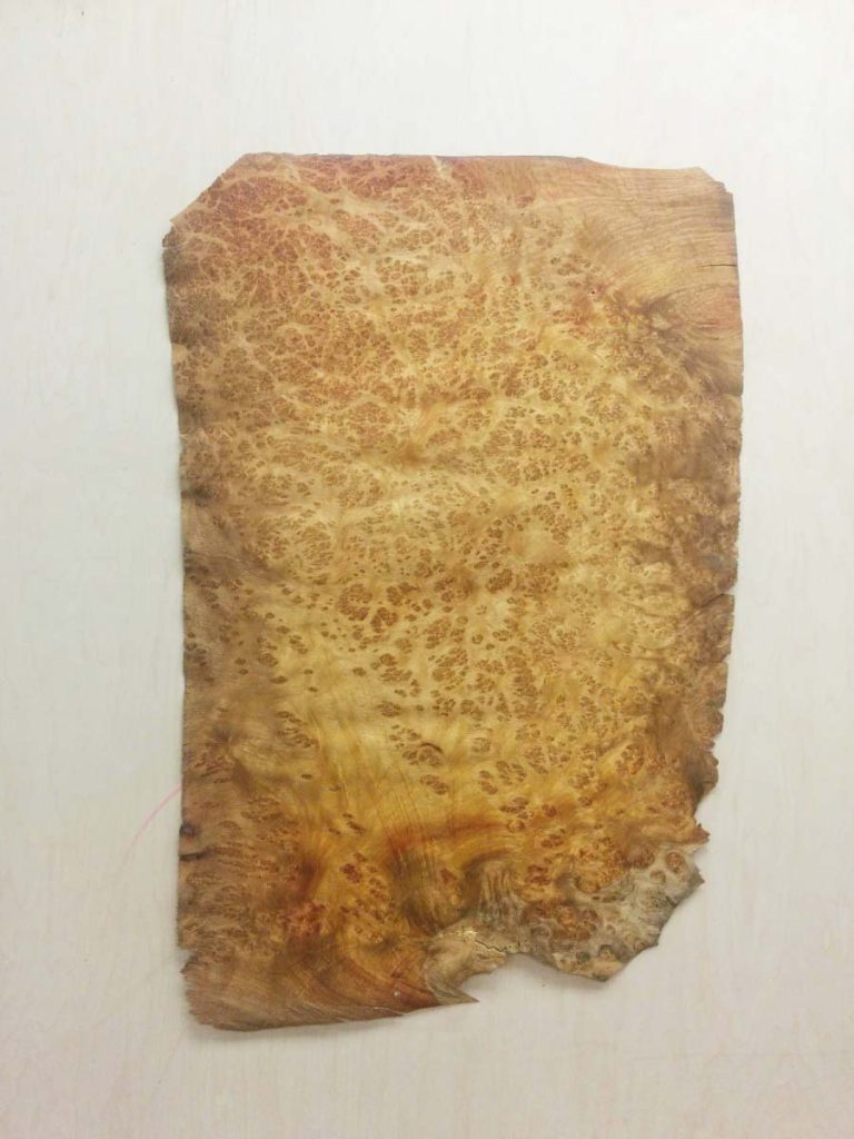 Description : Placage brun miel à brun rouge au parfum résineux. Usage haut de gamme en marqueterie, panneaux décoratifs, coffrets, intérieurs.